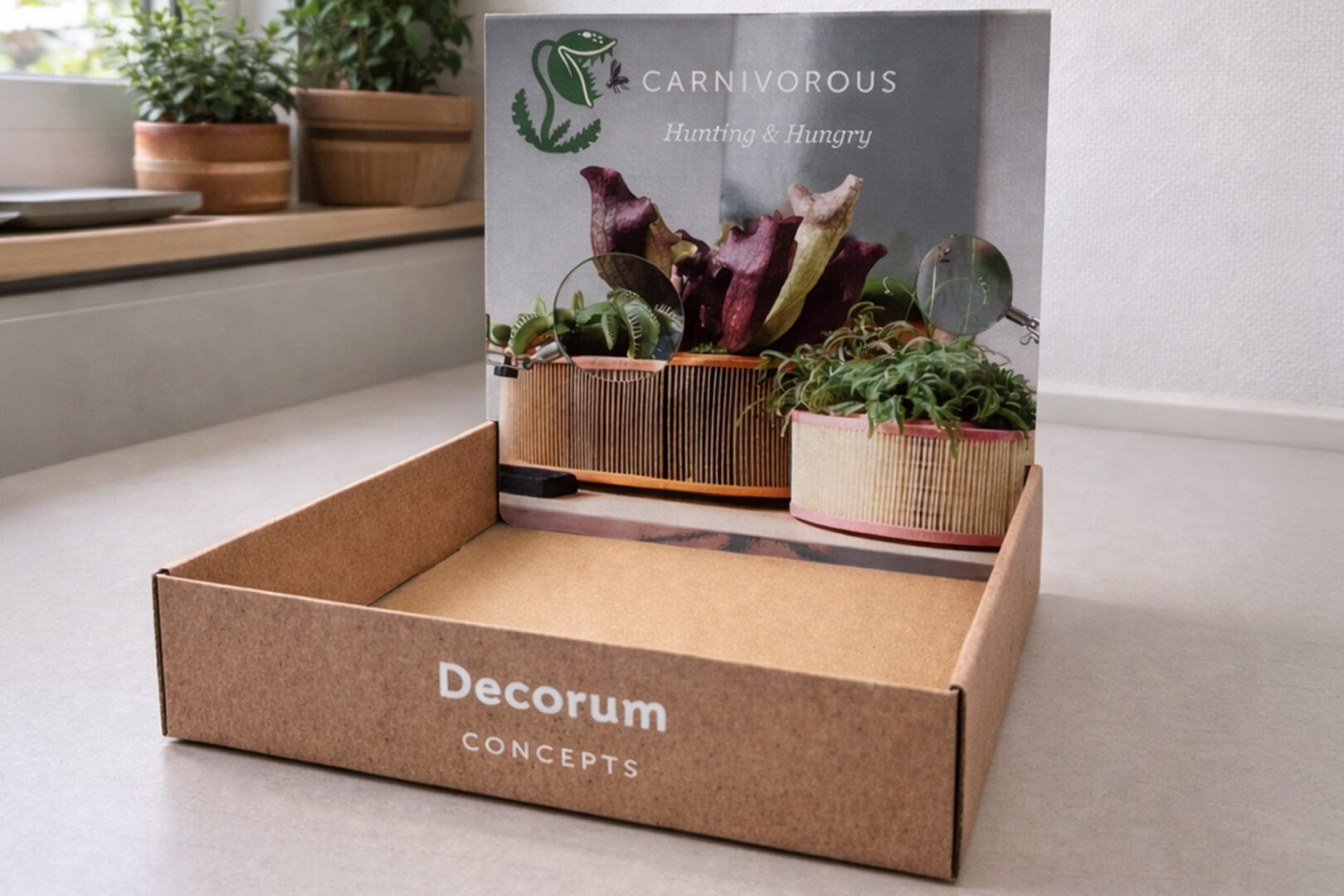 Een mooie samenwerking tussen Decorum en Bureau Berteler heeft geleid tot een opvallende en doordachte verpakking voor vleesetende planten. Waar Decorum staat voor kwaliteit en uitstraling binnen het groenconcept, bracht Bureau Berteler creativiteit en strategisch design samen in een verpakking die zowel beschermt als verleidt.